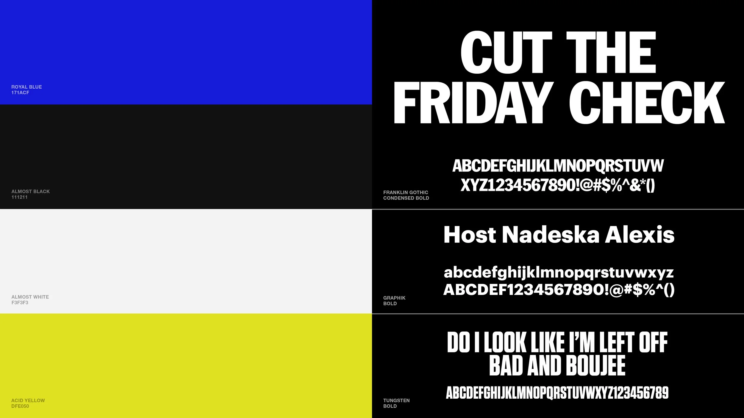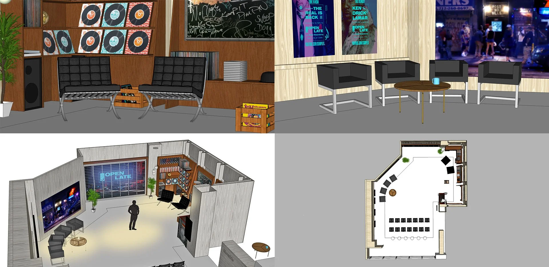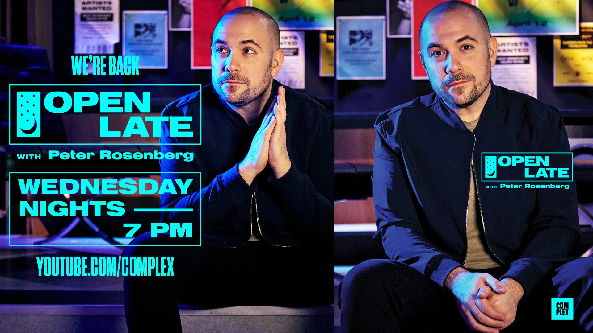 Open Late was Complex’s first late-night show… filmed in the morning. The show covered topics in the music and entertainment sphere, set in a stylized record shop kept open after closing where friends can hang out and bullshit all night. Neon, a metal gate, a record corner, and oversize screens with animated posters graced the back stage in the Complex Office.